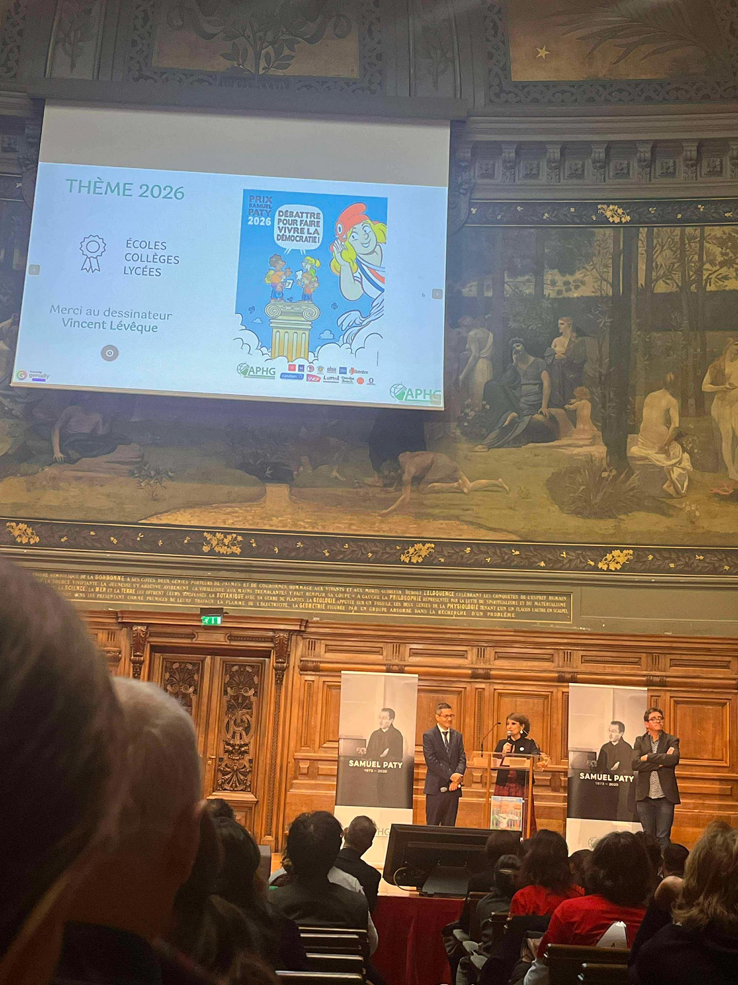 Quel honneur d’avoir créé l’affiche du Prix scolaire Samuel Paty 2025 et d’avoir pu la présenter sous les ors du Grand Amphithéâtre de La Sorbonne en présence du Ministre de L’Education et des lauréats de cette année.